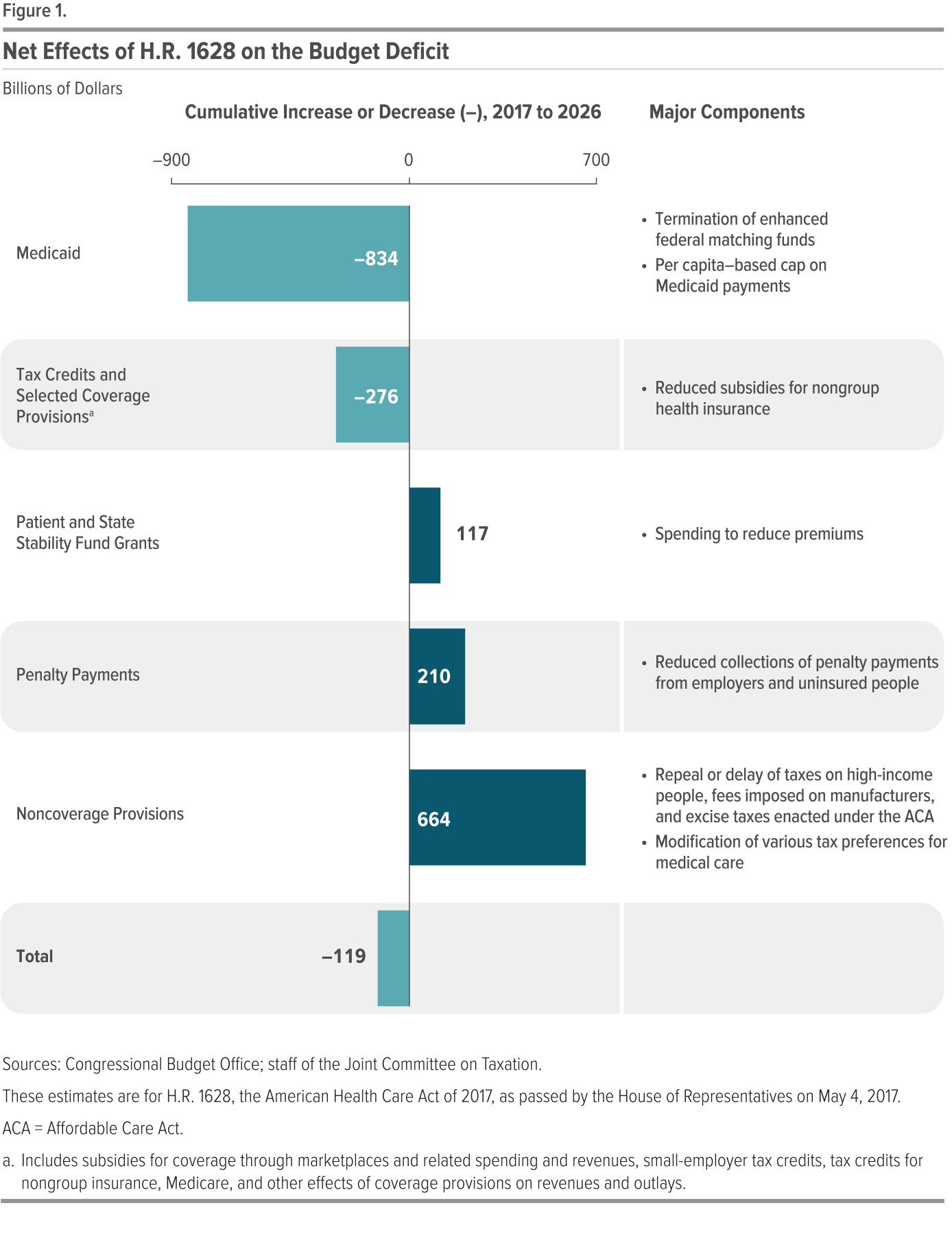 The CBO and JCT estimate that, over the 2017-2026 period, enacting H.R. 1628 would reduce direct spending by $1.1 billion and reduce revenues by $992 billion, for a net reduction of $119 billion in the deficit over that period (see Table 1 below). The provisions dealing with health insurance coverage would reduce the deficit, on net, by $783 billion; the non-coverage provisions would increase the deficit by $664 billion, mostly by reducing tax revenues.