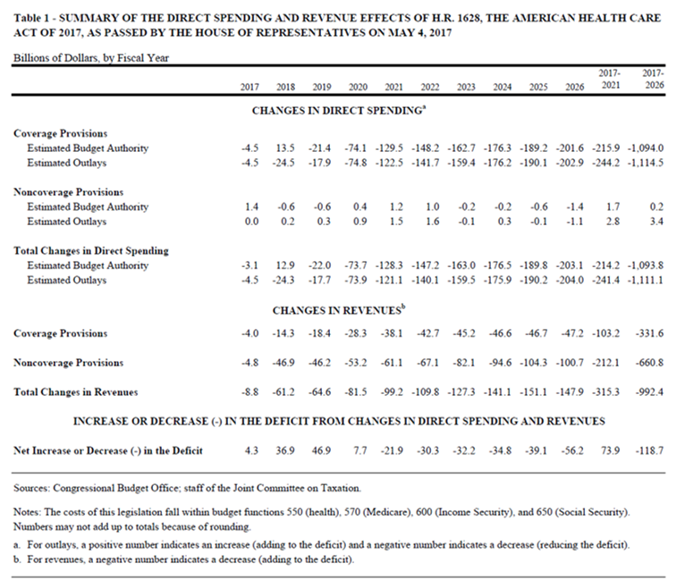 On May 4th, the House of Representatives passed H.R. 1628, the American Health Care Act of 2017. The Congressional Budget Office (CBO) and the staff of the Joint Committee on Taxation (JCT) estimated that enacting that version of H.R. 1628 would reduce the cumulative federal deficit over the 2017-2026 period by $119 billion.